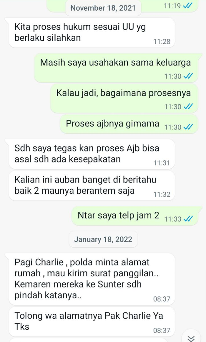 Pihak pengembang menawarkan untuk membeli tanah SHM No. 5/Lemo dengan nilai awal Rp10 miliar untuk luas tanah 8,71 hektare. Nilai tersebut kemudian meningkat menjadi Rp16,5 miliar. Namun, negosiasi tersebut gagal, dan pada 30 September 2021, Charlie diancam akan menghadapi proses pidana dan perdata.